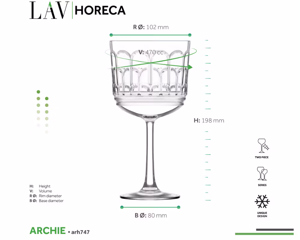 LAV Archie vinglas 47 cl kombinerar generös kapacitet, elegant design och professionell funktion – ett självklart val för vinservering med hög standard.
