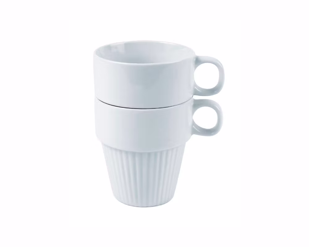 Tillverkad i fältspatporslin, vilket ger hög slitstyrka och lång livslängd även vid intensiv användning. Den stapelbara konstruktionen gör muggen enkel att förvara och effektiv i köksmiljöer där utrymme är viktigt.