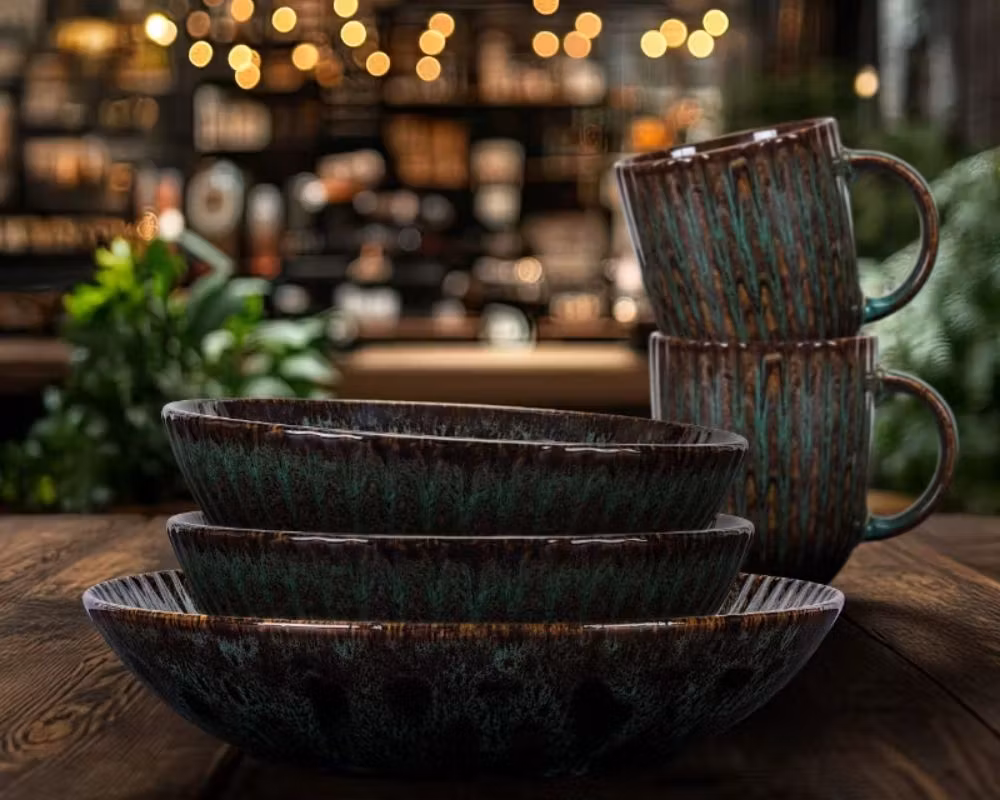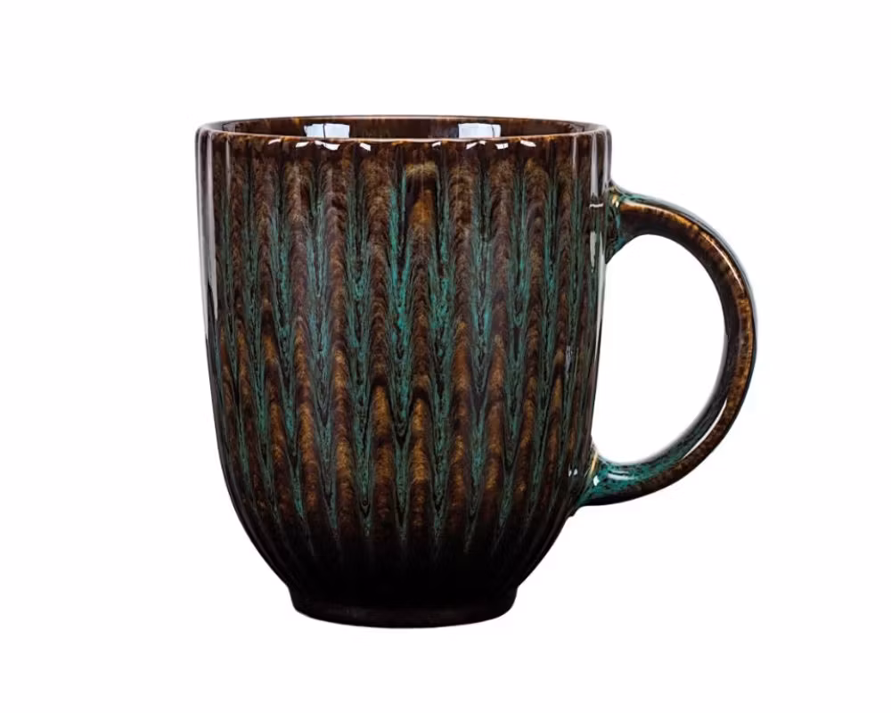 Denna mugg 35 cl i porslin kombinerar elegant relieffdesign med en blank melerad dekor i grönt och svart, vilket ger ett exklusivt och levande uttryck på bordet. Perfekt som kaffemugg, temugg eller serveringsmugg för restaurang, café och hotell.
