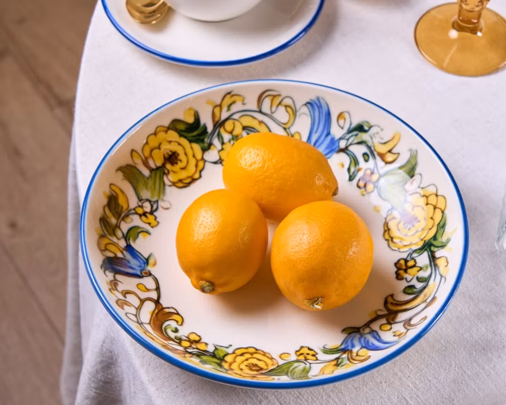Den levande blå bården, inspirerad av syditalienska motiv, ger varje måltid en inramning som känns både familjär och festlig.