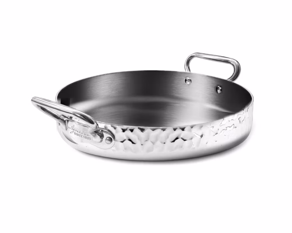 En professionell stekpanna från Agnelli tillverkad i 3-lagers Aluinox, där aluminiumkärnan omsluts av rostfritt stål för optimal prestanda. Konstruktionen ger jämn och kontrollerad värmespridning, snabb uppvärmning och exakt temperaturkontroll – perfekt för stekning, bryning och sautering.